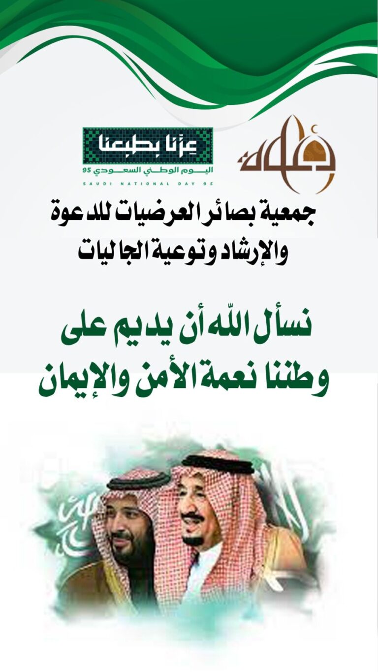 تتقدم جمعية بصائر العرضيات للدعوة والارشاد وتوعية الجاليات بكافة اعضائها ومنسوبيها باسمى التهاني والتبريكات لقيادة هذا الوطن وشعبه الكريم بمناسبة اليوم الوطني 95 نسأل الله أن يديم علينا الامن والامان